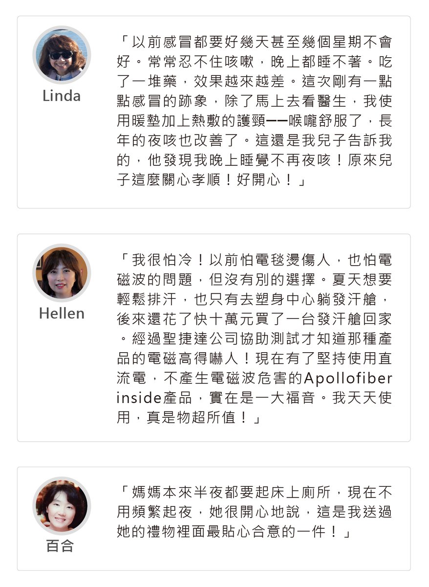 本热毯採用來自矽谷航太科技的apollofiber inside®超微電熱纖維布技術,做到每根纖維的交織點都均勻發熱,不會造成局部過熱。就算設定到最高溫,躺在上面也只會像泡溫泉般感到全身舒適溫暖,没有电磁波。,而且兼具远红外功效,远红外效果又专业机构认证。